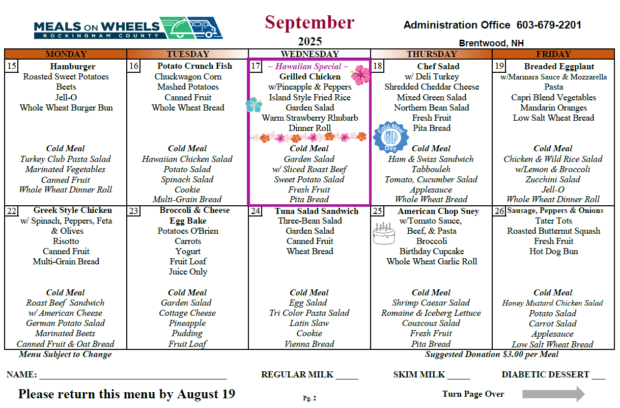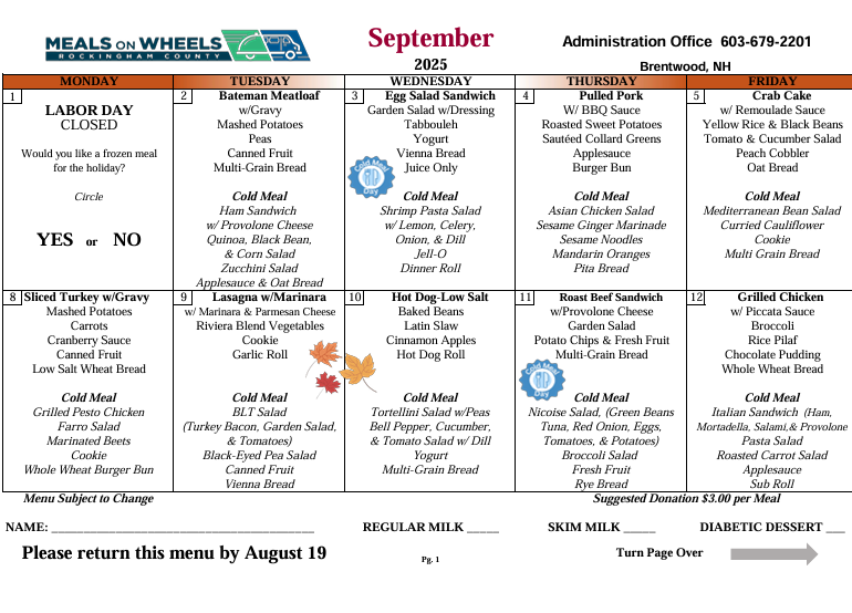 Just pick up the phone or send us an email. We’d love to hear from you!(603) 679-2201 Admin@RNMOW.org