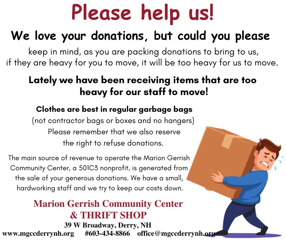 The Thrift Shop is the main source of income for the Marion Gerrish Community Center. The revenue from the sale of donated items is used to operate our 501C3 nonprofit organization. In order to reduce waste, please take the time to check your donations to ensure that they are in sellable condition (clean, without odor, unbroken, etc.). We reserve the right to refuse any donation.